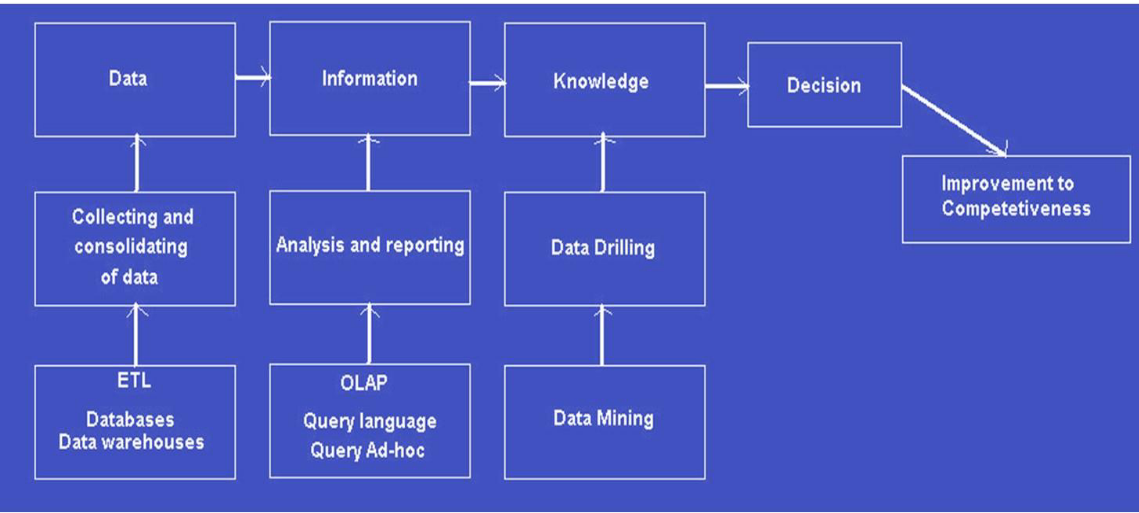 - “The process of taking large amounts of data, analyzing that data and presenting a high level set of reports that condense the essence of that data into the basis of business actions, enabling management to make fundamental daily business decisions ” (Stackowiak et al 2007).