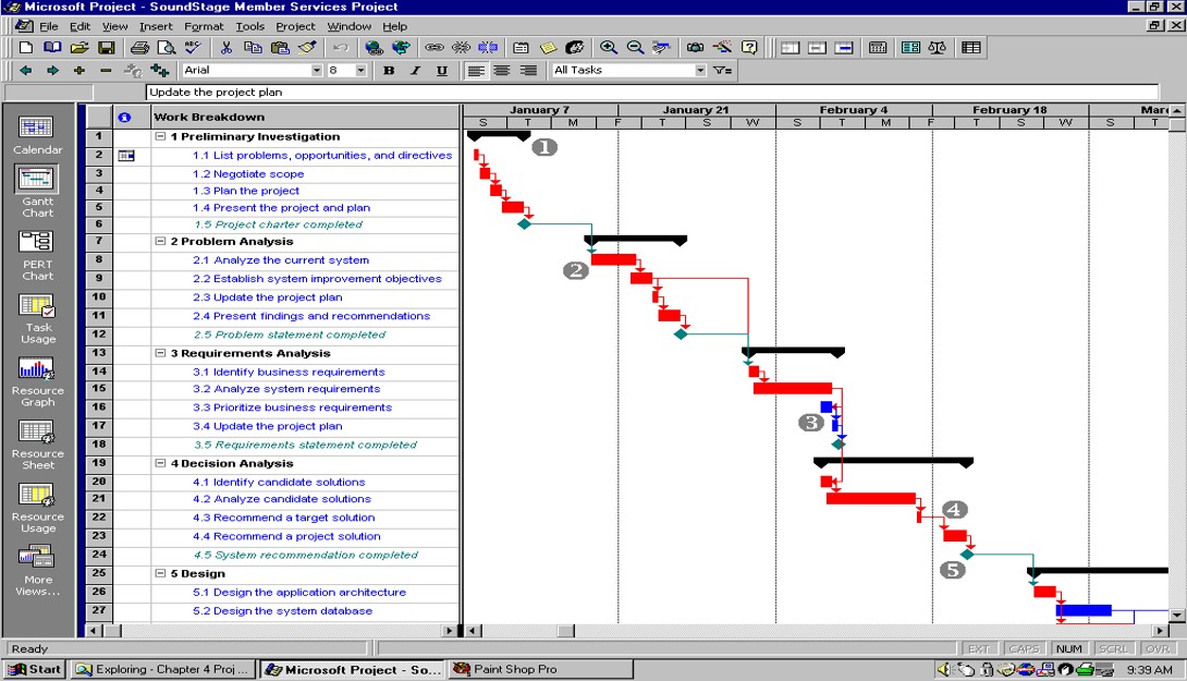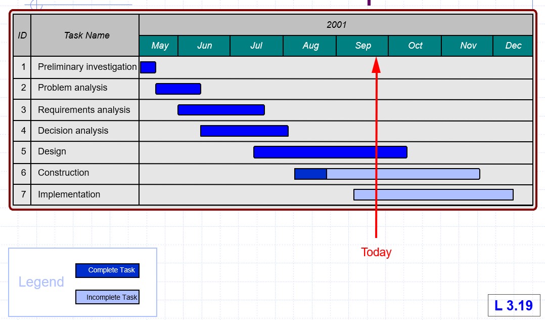 - Gantt Chart (or common bar chart) shows sequence and time of tasks